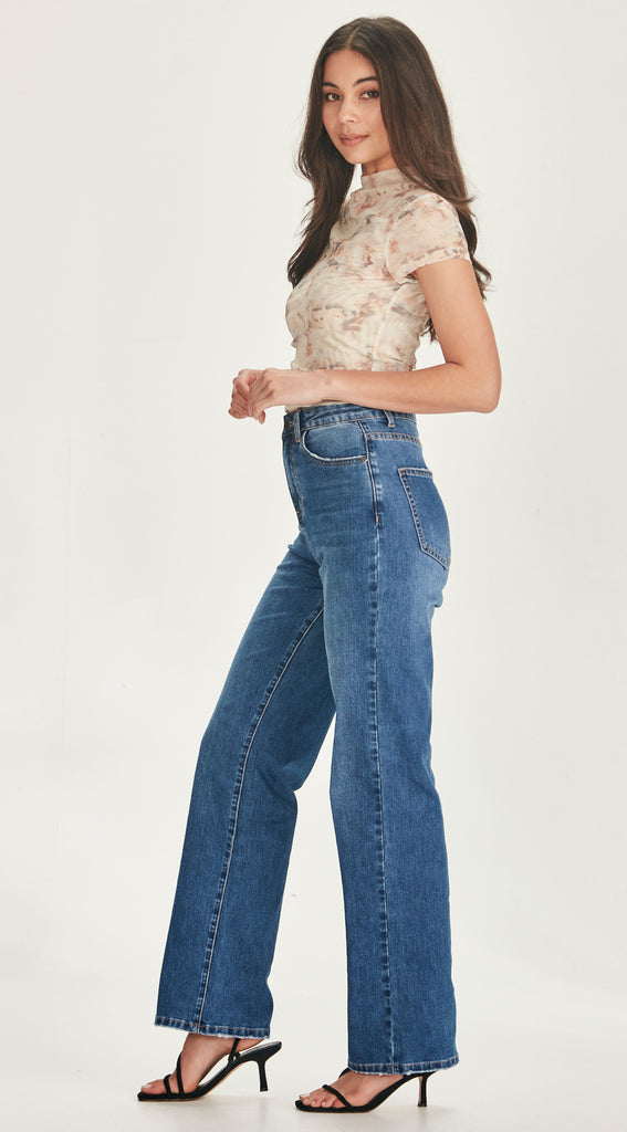 High waisted stretch denim straight leg jean.