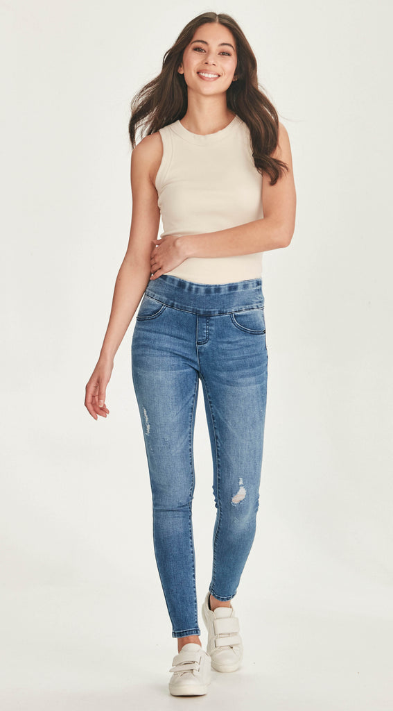 With a super slimming and comfy new waist band design, soft stretch denim and great bounce back that holds you firm where it needs to.
