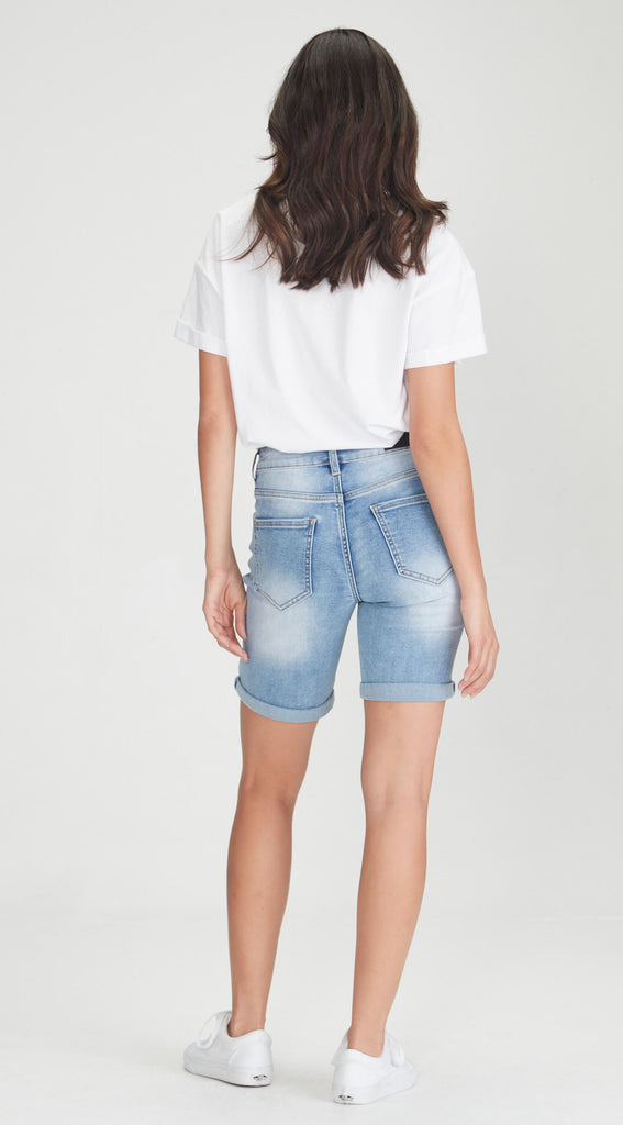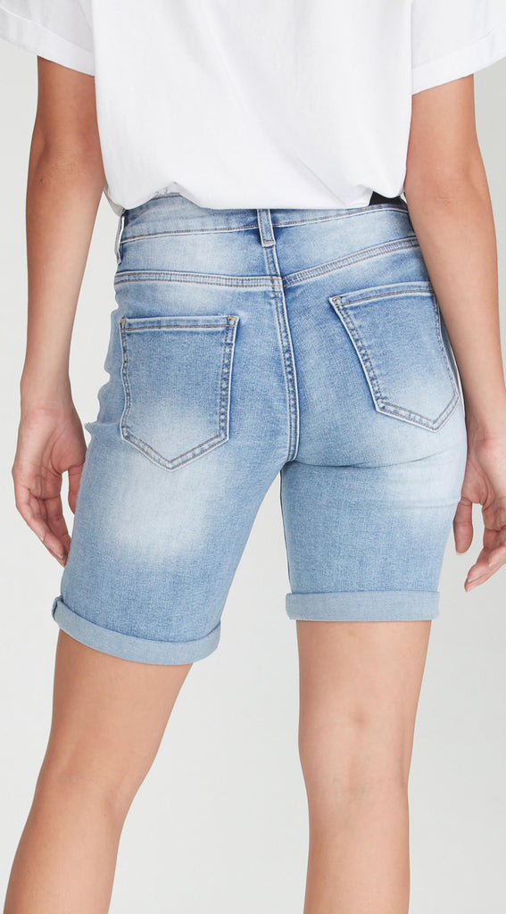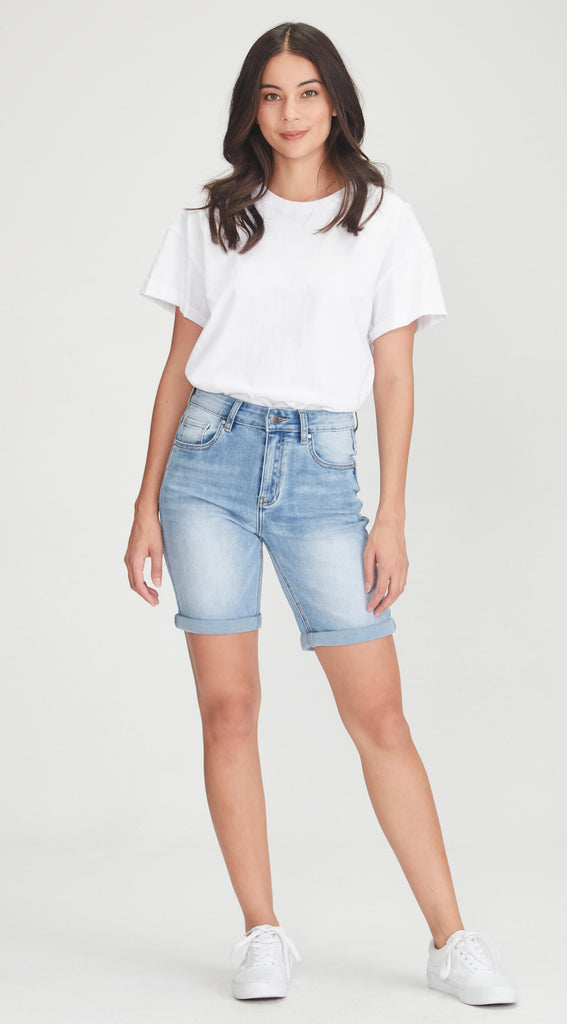 Mid waisted long shorts with a super comfy soft stretch denim and a rolled cuff.