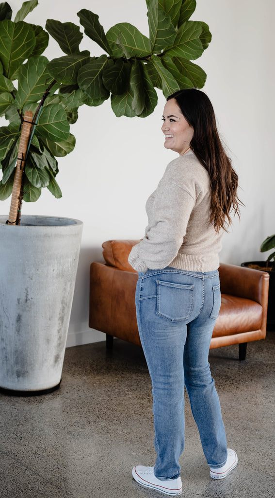 A flattering straight leg jean in a premium soft stretch denim, with a slimmer fit through the waist and thighs and a classic tapered, straight lower leg fit. Designed with a genius stitch pattern at the back for a peachy push up look. The ultimate feel good look good jean.