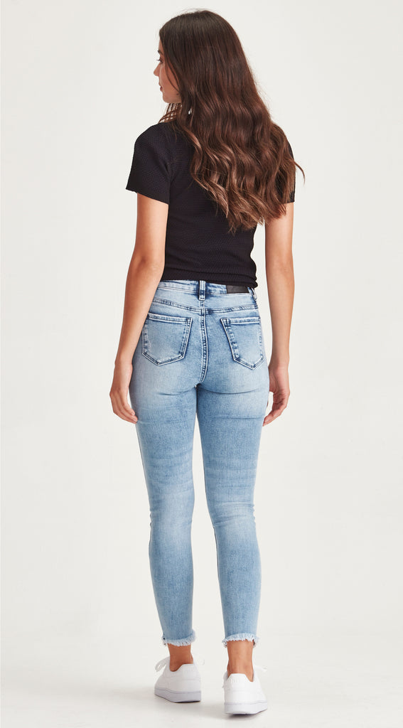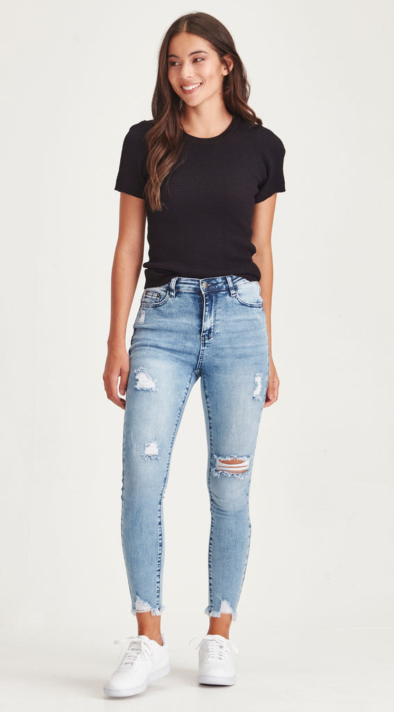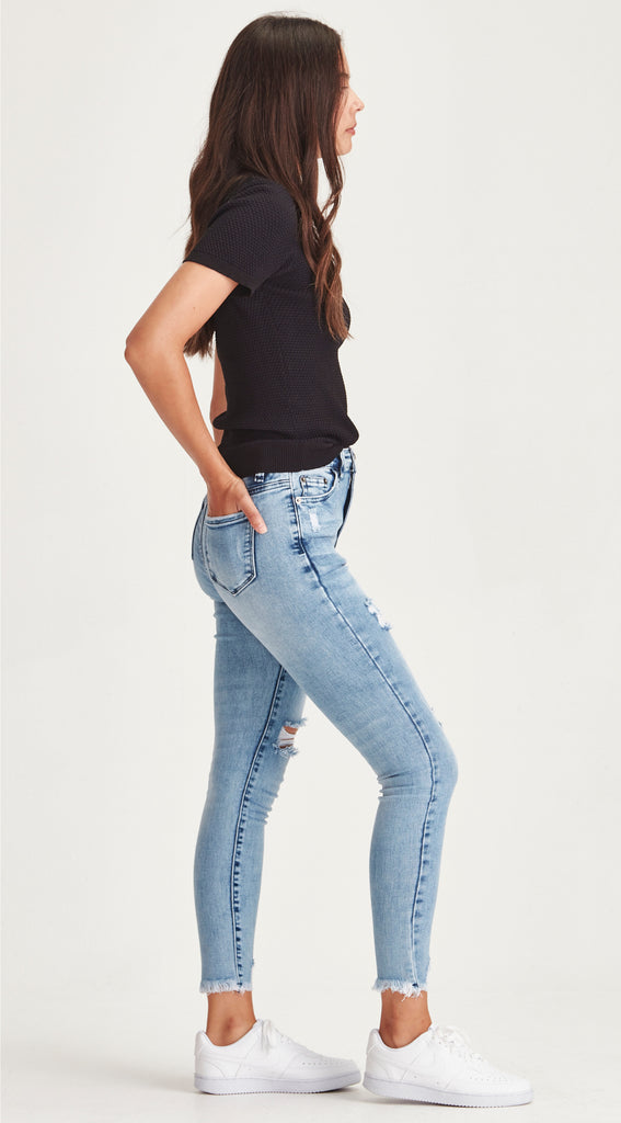 Mid to high waisted stretch denim skinny jean with rips and a raw hem.