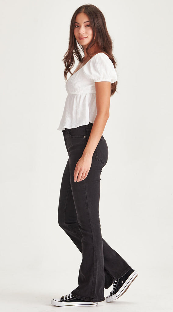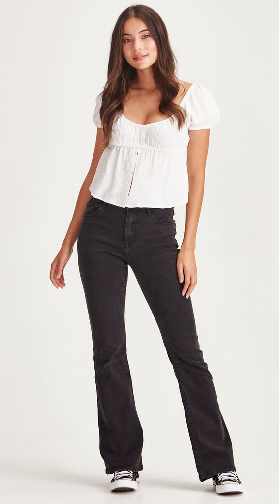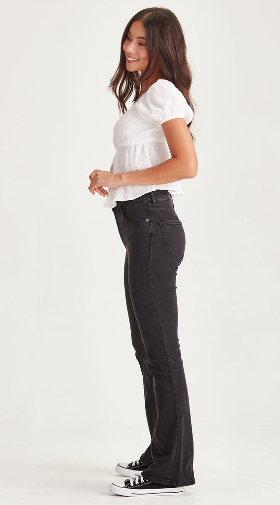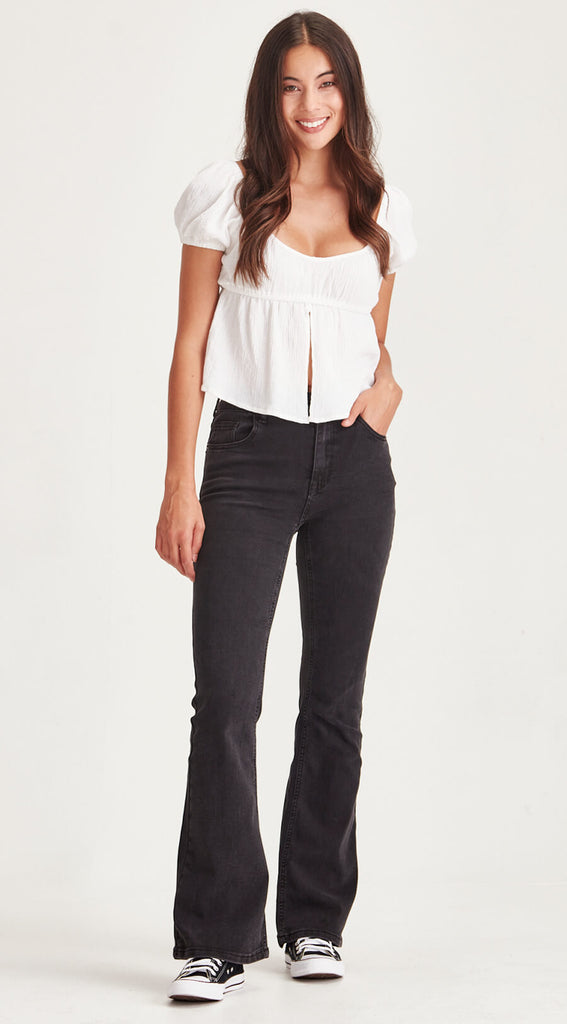 Mid to high waisted flared jean. NEW SHORT LENGTH.