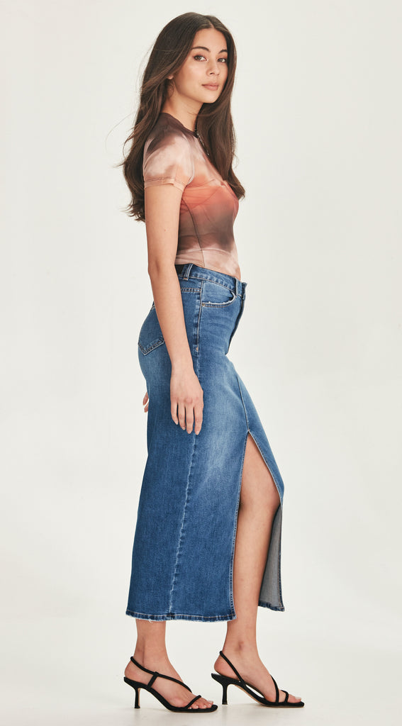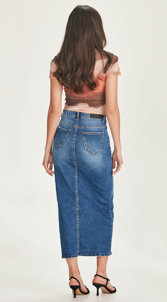 Comfortable stretch denim skirt with front split in the perfect blue colour.