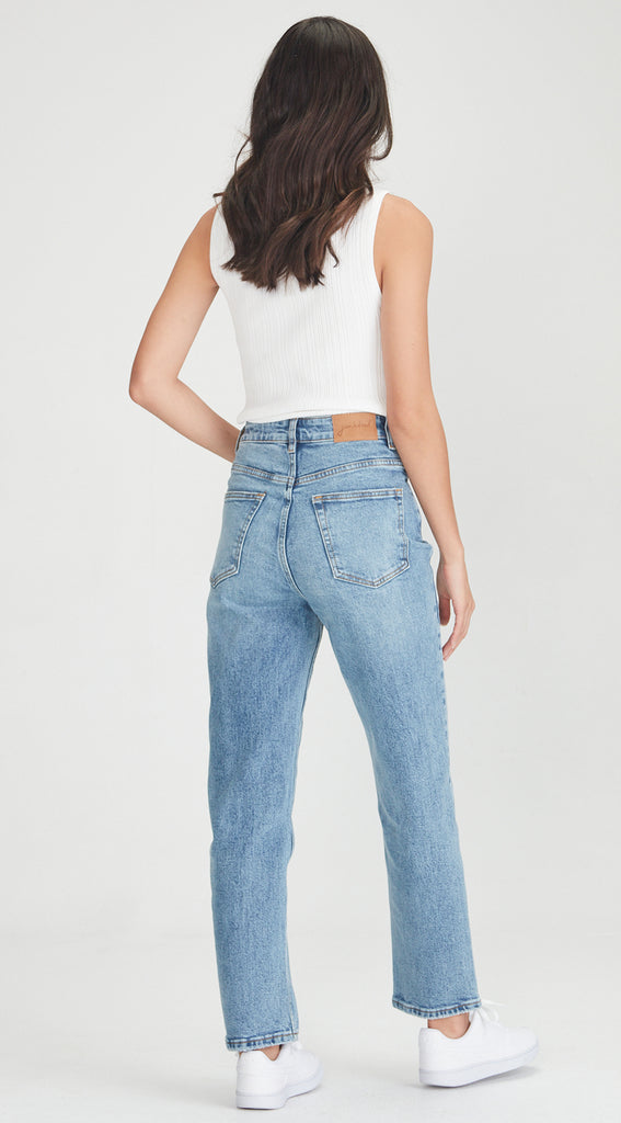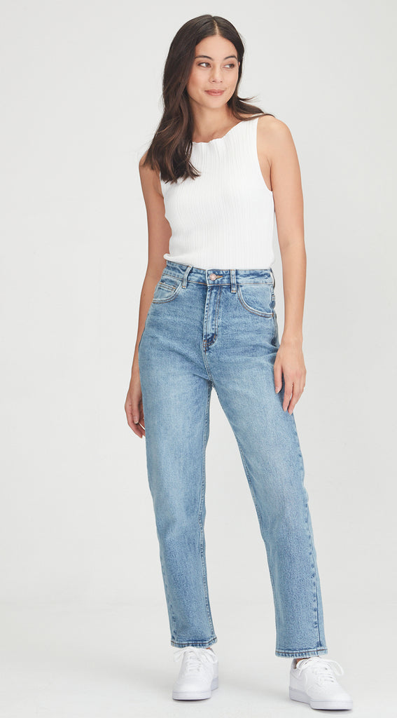 A classic high waisted mom jean that fits slimmer to the waist & body with a relaxed straight leg design. In a comfortable low stretch denim.