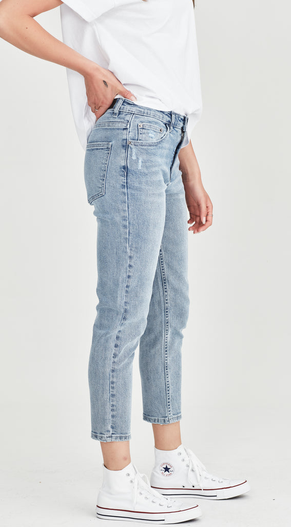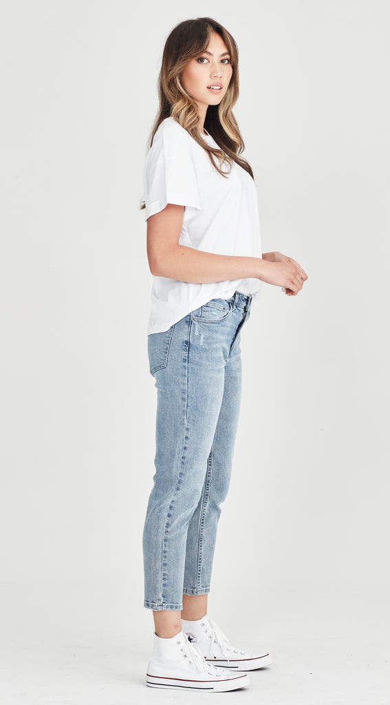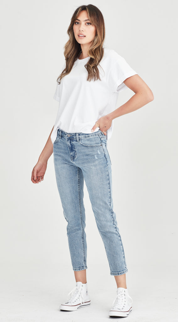 With some lightly scratched detail on the front and a tapered straight leg fit. Also looks great rolled up. Check out our fit video below.