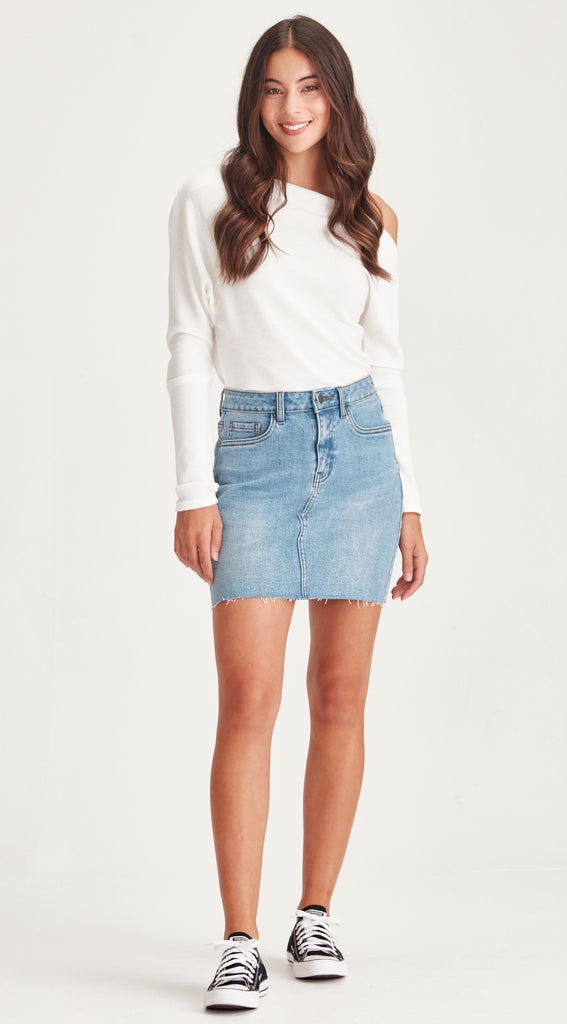 A great everyday soft stretch denim skirt with a raw hem, fixed waist band with belt loops, zip fly in a pre-shrunk classic 5 pocket design. 95% cotton and 5% spandex.